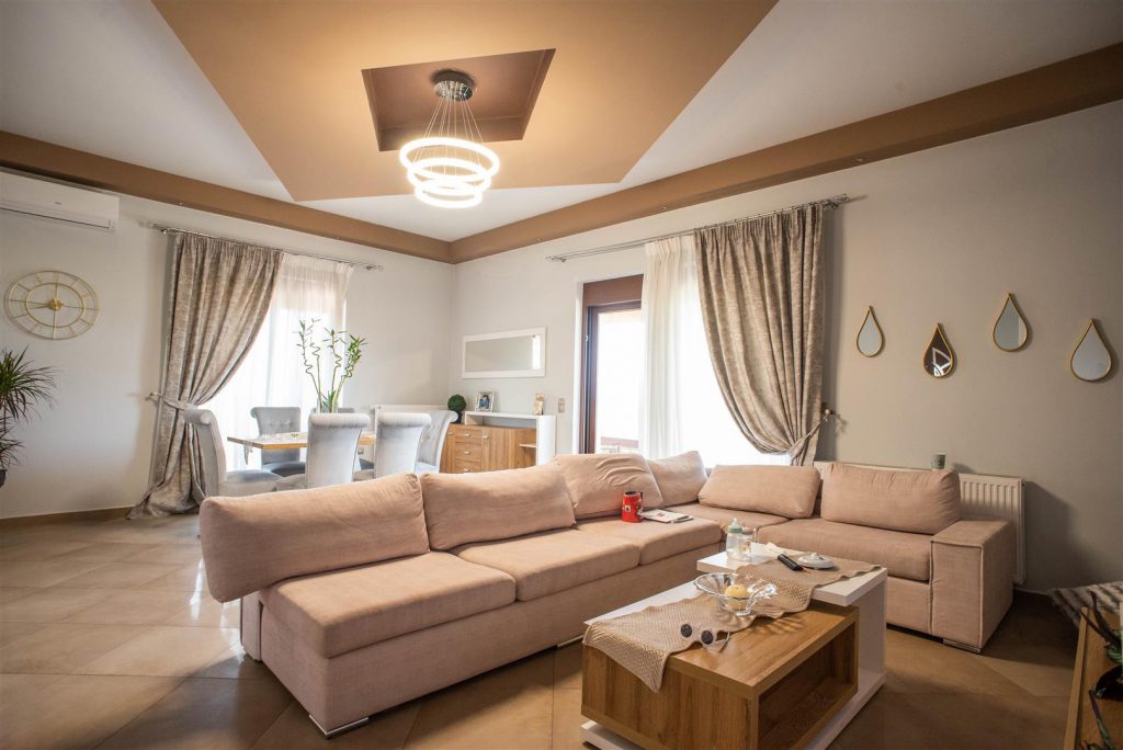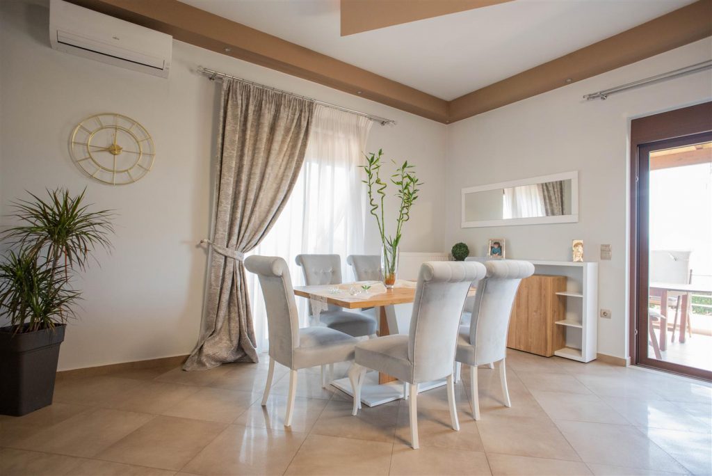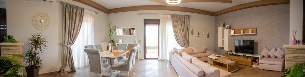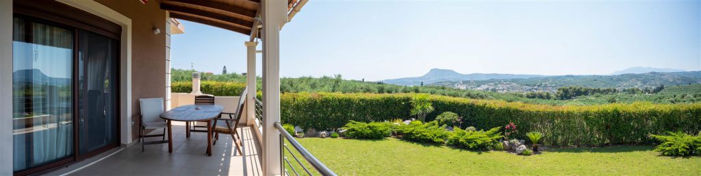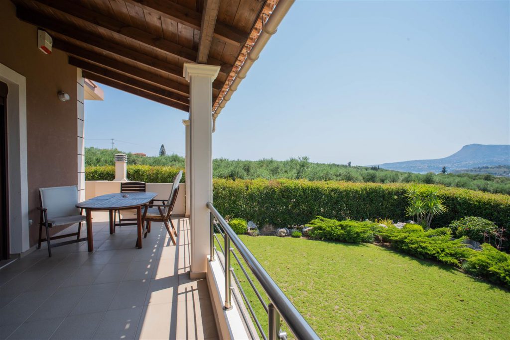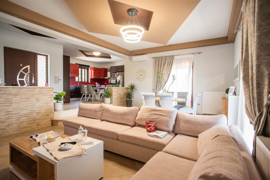 Δύο σκαλοπάτια πιο κάτω βρίσκεται το σαλόνι στη δεξιά πλευρά και η τραπεζαρία στην αριστερή πλευρά. Δύο σετ μπαλκονόπορτες ανοίγουν στο σκεπαστό μπαλκόνι με θέα στους κήπους, τους ελαιώνες και ολόκληρη την οροσειρά του Λευκού Βουνού!