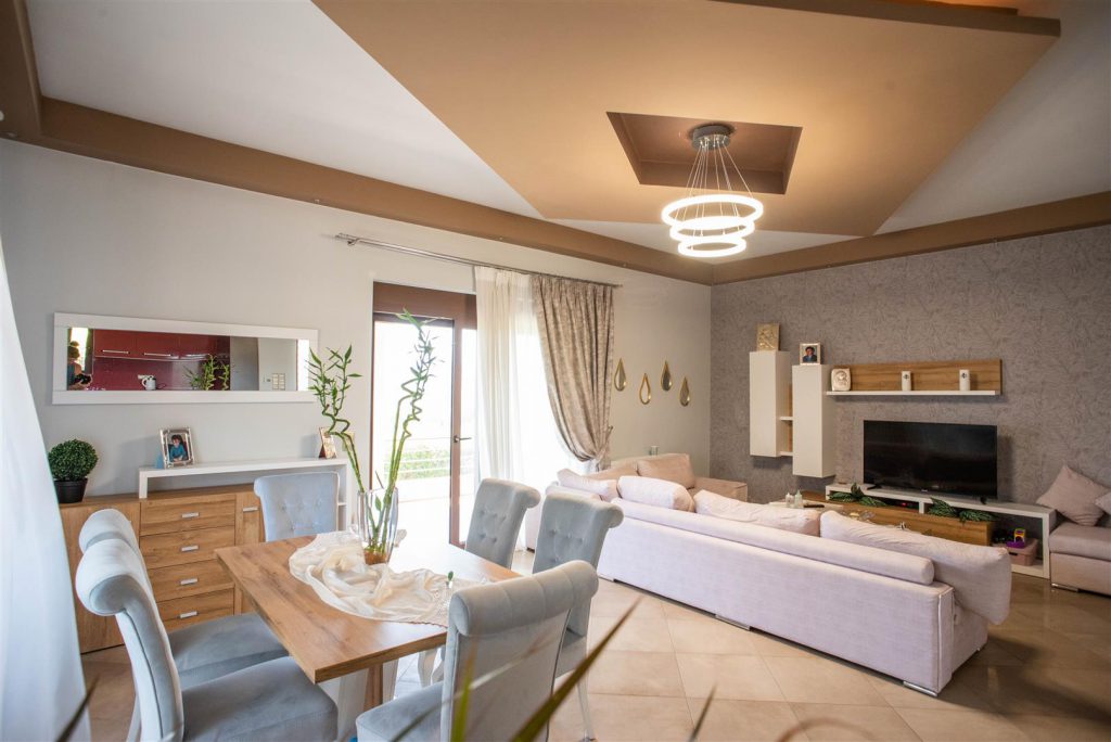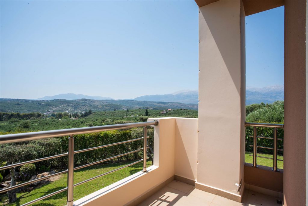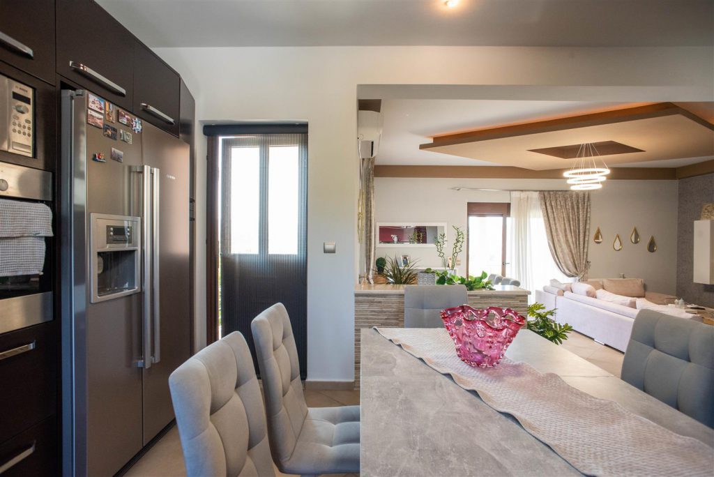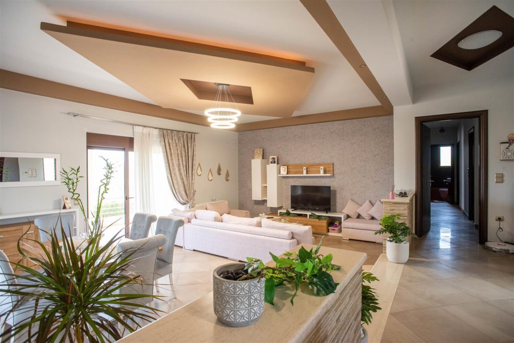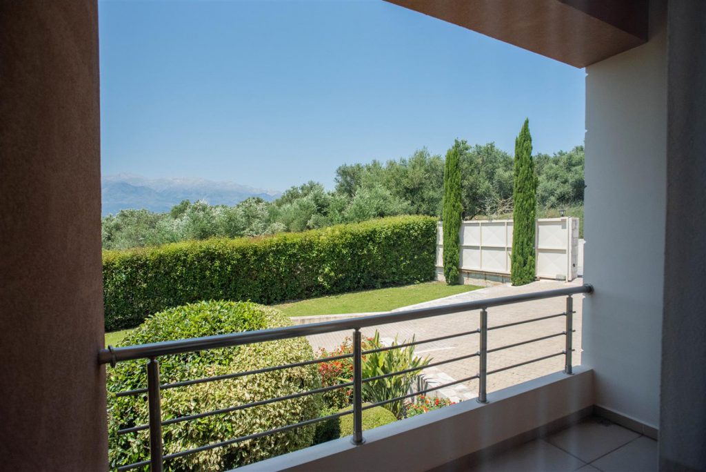 Δύο σκαλοπάτια πιο κάτω βρίσκεται το σαλόνι στη δεξιά πλευρά και η τραπεζαρία στην αριστερή πλευρά. Δύο σετ μπαλκονόπορτες ανοίγουν στο σκεπαστό μπαλκόνι με θέα στους κήπους, τους ελαιώνες και ολόκληρη την οροσειρά του Λευκού Βουνού!
