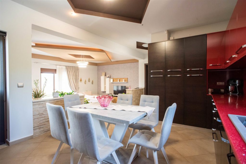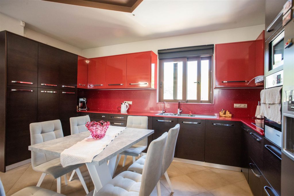 Η κουζίνα σε σχήμα «Π» είναι πλήρως εξοπλισμένη και διαθέτει ηλεκτρικές συσκευές από ανοξείδωτο ατσάλι. Τα κάτω ντουλάπια είναι από σκούρο ξύλο, ενώ τα πάνω είναι γυαλιστερά κόκκινα. Το πλακάκι στην κουζίνα είναι επίσης κόκκινο, για να ταιριάζει με τα ντουλάπια. Υπάρχει χώρος για τραπέζι και καρέκλες και δίπλα στην κουζίνα υπάρχει μια πόρτα που οδηγεί στο σκεπαστό μπαλκόνι.