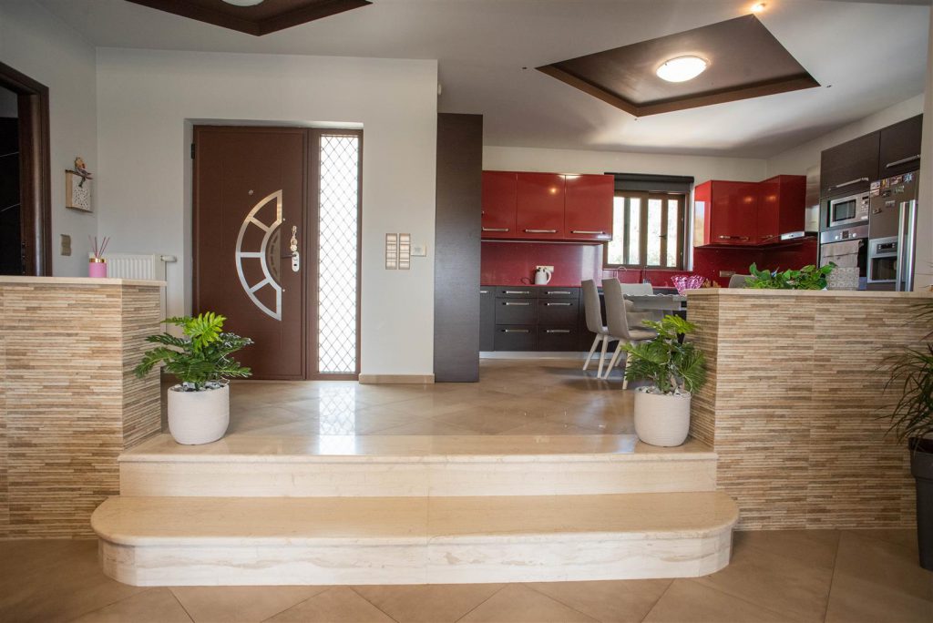 Η κύρια είσοδος βρίσκεται λίγα σκαλοπάτια πάνω από το χώρο στάθμευσης και είναι πλήρως καλυμμένη και προστατευμένη. Η κύρια πόρτα ανοίγει σε έναν πολύ ευρύχωρο χώρο κουζίνας/σαλονιού/τραπεζαρίας. Το σαλόνι και η τραπεζαρία βρίσκονται σε διαφορετικό επίπεδο, μόλις δύο σκαλοπάτια πιο κάτω από την κουζίνα.