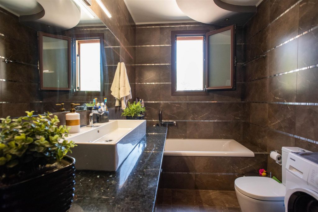 Τα μπάνια είναι πολύ μοντέρνα και καλά εξοπλισμένα, το ένα με καφέ και μαύρα ντουλάπια και πλακάκια και μπανιέρα πλήρους μήκους, και το άλλο με κόκκινα πλακάκια και μισή μπανιέρα. Το μεγαλύτερο μπάνιο στεγάζει επίσης το πλυντήριο ρούχων και περιλαμβάνει θερμαινόμενη κρεμάστρα για πετσέτες.