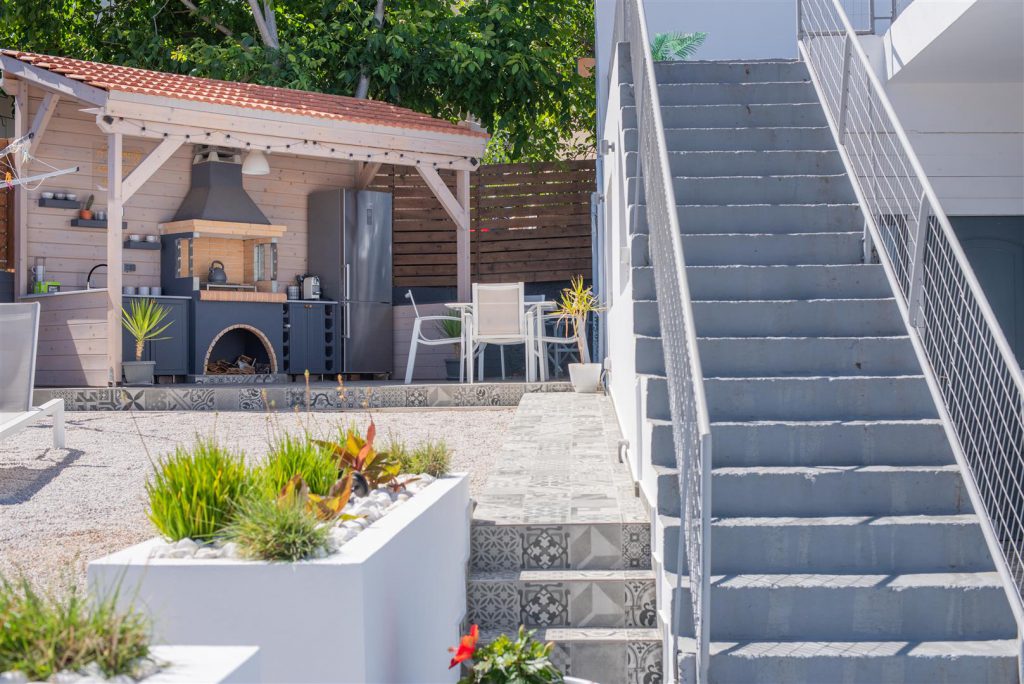 A newly built BBQ is located at the edge of the garden, covered by a 9m2 pergola, and includes a sink, fridge/freezer, BBQ and plenty of storage cupboards. This area is nicely tiled and has room for dining in the shade.