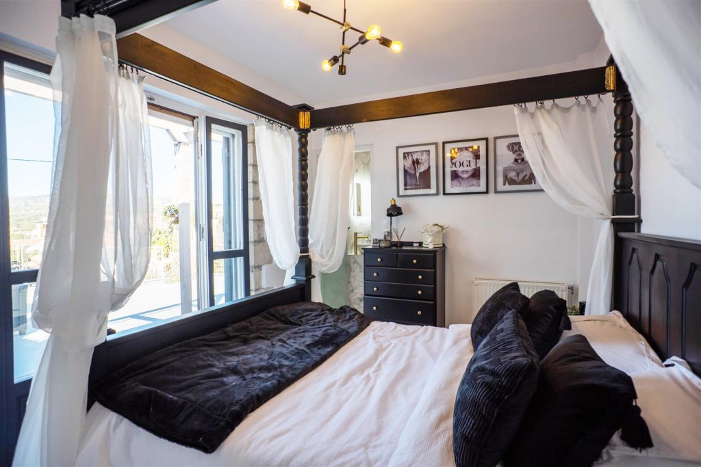 The recently built master suite has a private large dressing room with a beautiful free standing roll top bath and wardrobe storage space. Through a stone arch you enter the bedroom waking up to beautiful sea view every day. This bedroom also has an en suite bathroom with lovely features such as rainfall shower, under sink storage and his and hers sinks!